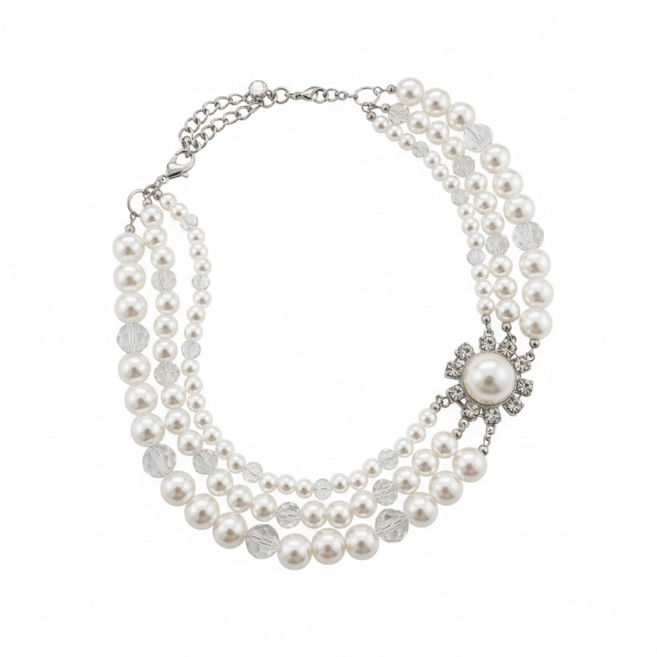 華やかなイミテーションパールデザインが首元を引き立てる、イミテーションパール3連ネックレス イヤリングセット!